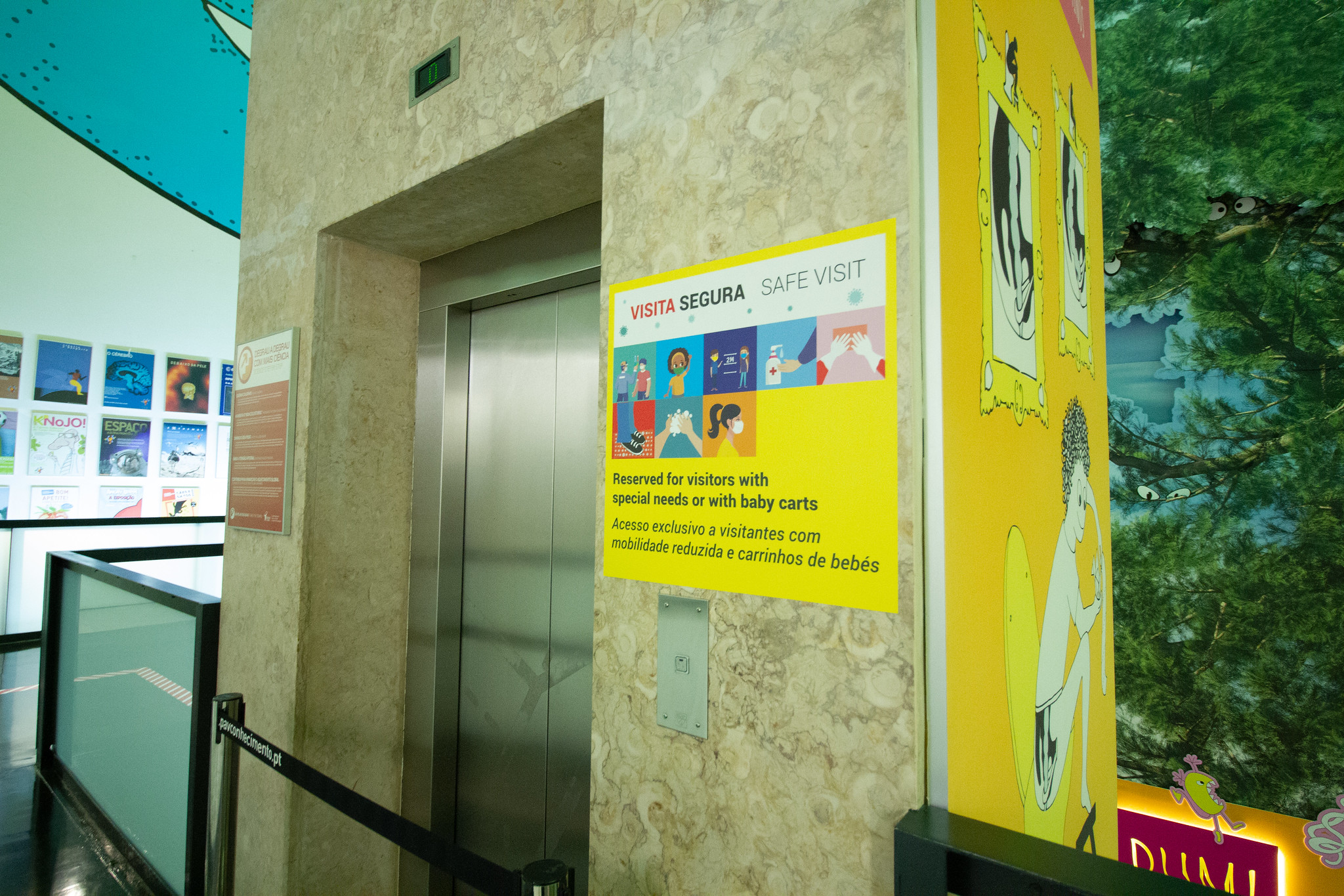 A utilização do elevador público situado na área expositiva encontra-se reservada a visitantes com mobilidade reduzida e carrinhos de bebé.